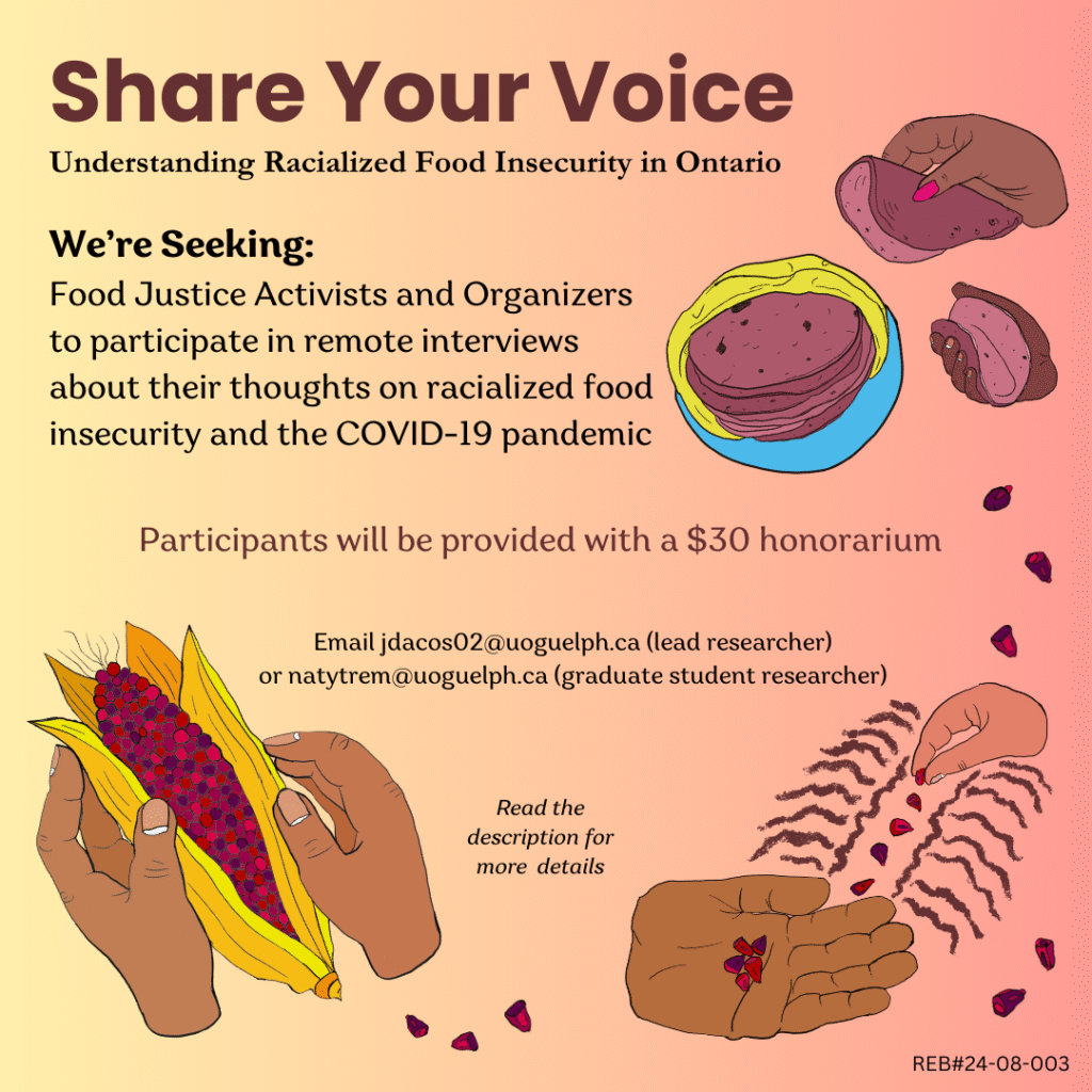 Share your voice and help promote food justice in Ontario! Exacerbated Hunger: Addressing Racialized Food Insecurity in the Era of COVID-19 (REB# 24-08-003) is seeking research participants to share their thoughts and experiences around racialized food insecurity and the COVID-19 pandemic. The project is specifically interested in the perspectives of three communities: 1) food justice […]