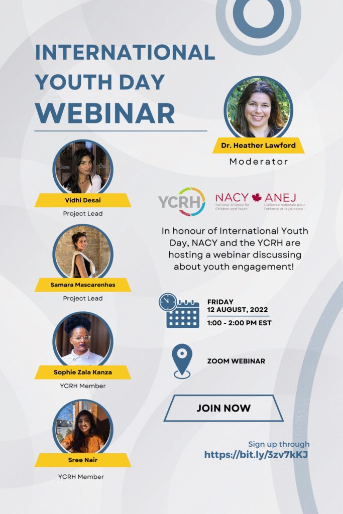In honour of International Youth Day, NACY and the YCRH hosted a webinar discussing youth engagement and adult allyship.